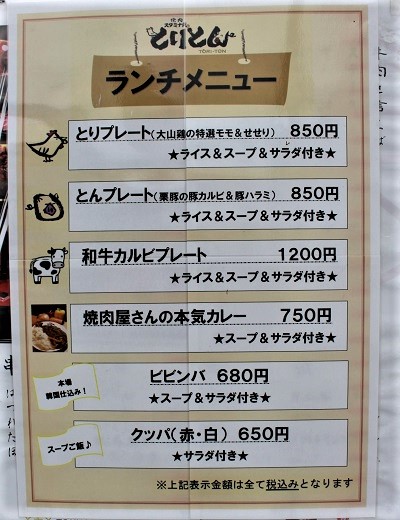 とりとんの魅力をよりお得に楽しめるランチメニュー。定番人気の「とりプレート」「とんプレート」各850円(税込)は、それぞれ大山どりの特選モモ&せせり/栗豚のカルビ&ハラミに、ライス、スープ、サラダが付いたお一人様焼肉セットです。