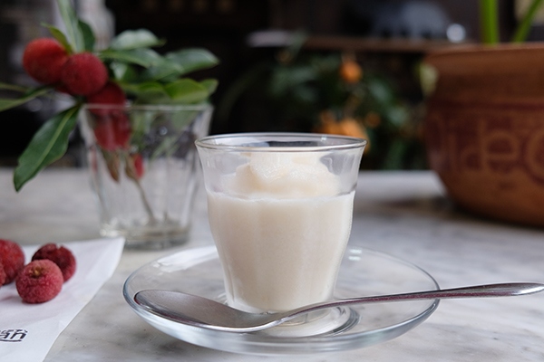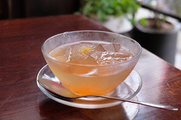 オーギョーチーには味がないため、様々なシロップと合わせて提供。写真は、広島産無農薬レモンで作ったシロップを加えた「レモンオーギョーチー」500円。暑い日にぴったりなスイーツです。