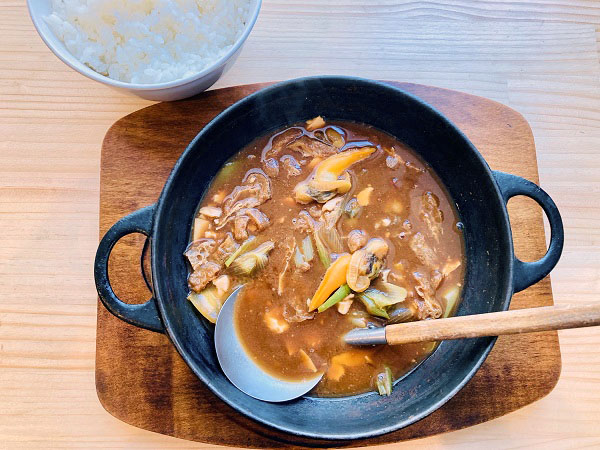 The evening menu features a host of skillet and cast iron hot pot dishes. In an eclectic mix that illustrates Mr. Fujii culinary history, there are Pacific flying squid, chorizo sausage or Japanese yam steak skillets, stuffed cabbage roll hotpot, fluffy omelette, and rice (omuraisu) and pizza, among many others. Mr. Fujii also makes seasonal preserved fish (zuke) and carpaccio!