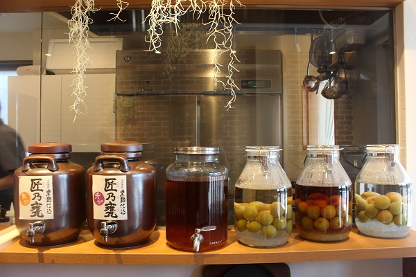 The restaurant features an open kitchen and a counter adorned with shochu barrels and Mr. Fujii’s homemade fruit liqueurs. “Around 70 to 80% of our customers are regulars, especially ladies,” said Ms. Fujii. “During the week our customers tend to be mainly business people and local residents but at weekends there’s a very wide age range, from families with children to senior couples and visitors to the museum. Some of our customers are third generation now!”