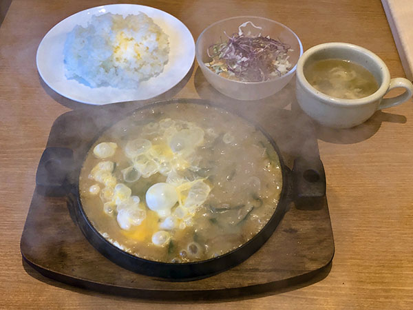 Once the steam had dissipated, we could clearly see the juju yaki, the onomatopoeically named signature dish at Fukagawatei. Onions, negi onions, and pork are simmered for hours, then ladled into the blazing hot skillet. Finally, garlic chives (nira) and egg are added and the tray brought to the table, literally cooking before your very eyes to a remarkable sweet and savoury perfection, with a slight hint of spice. Exactly as Ms. Fujii said, the flavours were surprisingly strong and made a great topping for the rice. It was excellent, very rich and savoury, filling but not overpowering. Served with a crisp salad, soup and some tasty koshi-hikari rice, the juju yaki makes an excellent lunch or dinner.