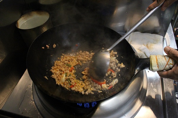 △匠の火入れ技で、チリやバジルのそれぞれの辛味と旨み、香りを引き出します