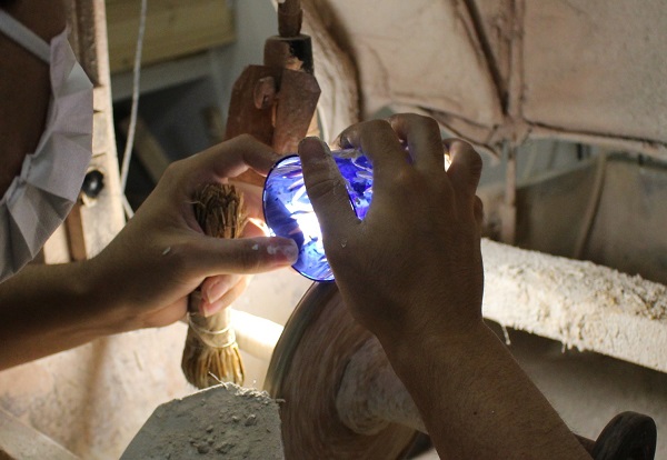 清水さんの作品の特徴は、全て伝統技法の“手磨き”であること。切子を施したガラスは、摺りガラスのように曇っているのですが、その部分を磨いて艶のある状態に仕上げる工程です。