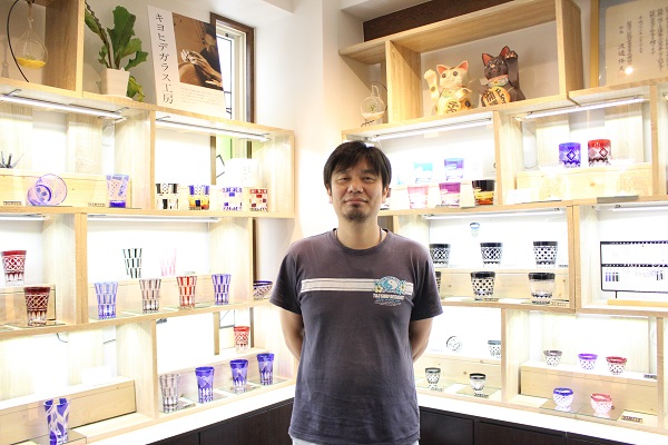 オーナーの清水秀高さんは、日本全国で約20名ほどしかいない江戸切子の伝統工芸士。幼少時よりモノづくりが好きだったという清水さん。中学時代デパートの催事で、のちの師匠となる江戸切子の伝統工芸士の実演を見て、その匠の技に魅了されたのをきっかけに江戸切子の世界へ。