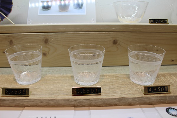 さて、そんな銘品の一部、ご紹介しましょう。こちらは定番のタンブラー。伝統的な矢来に玉を入れた模様や市松模様は、贈答品として根強い人気です。