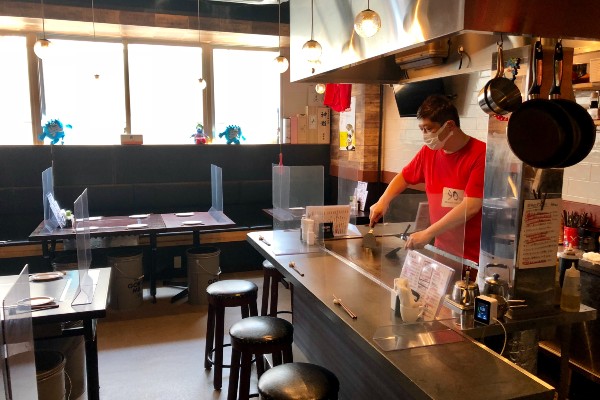 The room is dominated by the large teppan hotplate with a short counter set in front, literally inches from the action. The emphasis is on reasonably-priced, multi-course dining featuring seafood sourced directly from Hiroshima. “We’re a Hiroshima-style street corner hotplate izakaya,” said Mr. Masutome, “and everyone is welcome.”