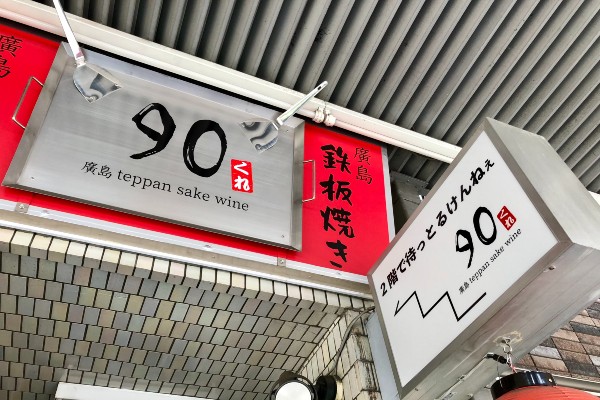While Hiroshima teppan sake wine 90 faces onto bustling Eitai Street just one minute from the nearest exit of Monzen-nakacho station, it’s on the second floor of a building accessed through a doorway at ground level. There’s a large signboard on the pavement during opening hours, and this marvellous replica of the hotplate itself is set above the door. You can’t miss it!