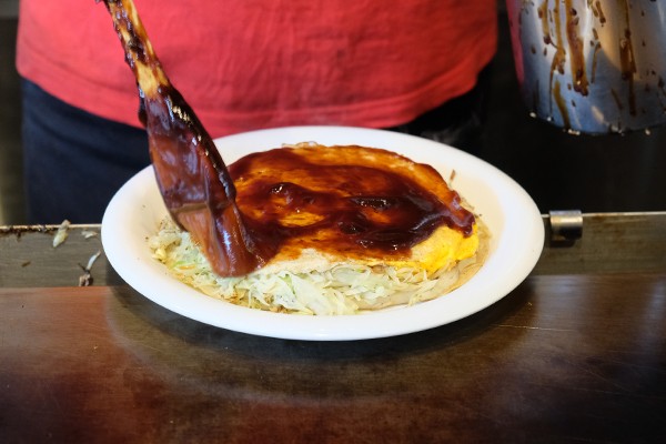 Okonomiyaki pancakes are slathered in a savoury sauce before serving. Hiroshima Teppan uses only the Mitsuwa brand sauces, produced in Hiroshima for 100 years. “It’s a high quality sauce, not particularly sweet, and that suits the palate of Tokyo residents,” explained Mr. Masutome.