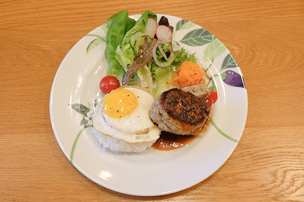日曜以外のランチタイム(11時から13時半)限定の「森下バーグ」は、自然農法による野菜が添えられたロコモコ風ハンバーグプレート。スープ付きで1,000円です。