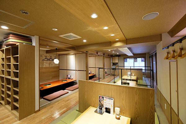 △奥の座敷には掘りごたつ式の席がずらり。仕切りをつければ半個室にも。