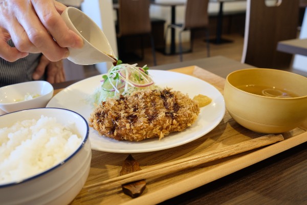 The most popular item is this minced pork and beef cutlet (menchi katsu) set at 850 yen. It’s minced beef, pork, sauteed onions, and seasonings shaped into patties, then dredged in flour, dipped into beaten egg and panko, before being deep-fried to crispy golden perfection.