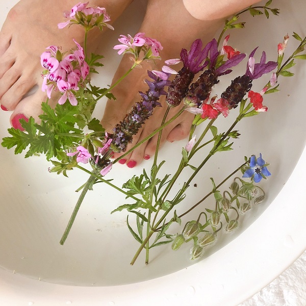 △フレッシュハーブとバスソルト入りのフットバス。季節によってはハーブのお花も。爽やかな香りに癒やされます