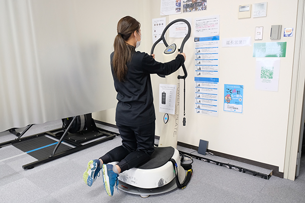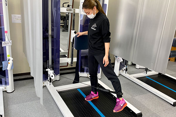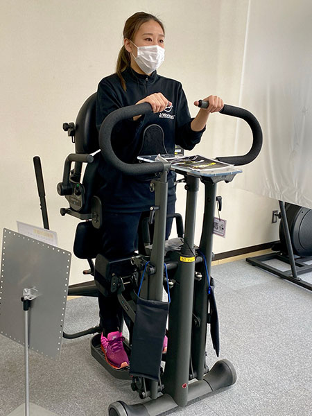 Physiotherapist Ms. Nishiyama demonstrated this air walker, which cleverly combines a standing frame into its design. The machine can be utilised by anyone who has difficulty standing, and is frequently used by senior customers.