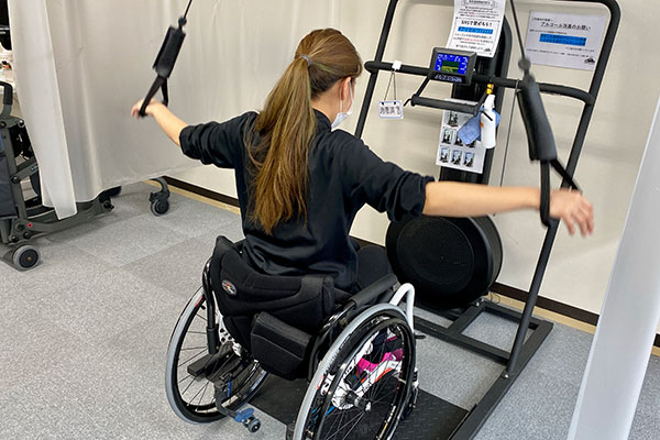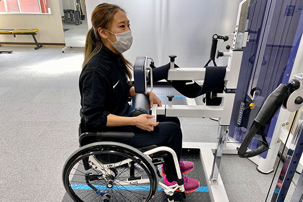Mr. Isa explained how wheelchair users’ greatest fear when working out is tipping over. New training machines designed for wheelchair users now feature safety devices to keep users firmly in place, as Ms. Nishiyama showed. The padded tube fits snugly over the lap, a chest pad protects the upper body and the whole body is firmly held by a thick belt.