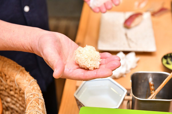 △握りの原点ともいわれる、本手返しで握る大将。美しく正確に、かつふんわりと成型できる伝統技法です