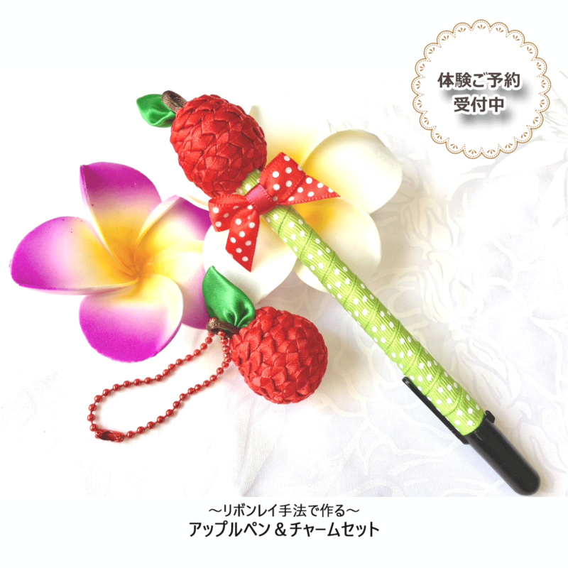 リボンレイ手法によるリンゴの形の可愛い飾りがついたペン&チャーム作りに挑戦してみませんか?