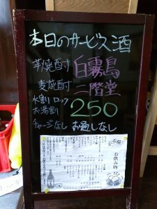 本日のサービス酒は「芋焼酎 白霧島」「麦焼酎 二階堂」各250円!