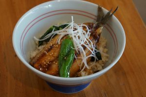 身がふっくらのイワシのかば焼きとししとう、ほうれん草のお浸し、白髪ねぎで上品に仕上げています。お好みで山椒を振りかけてお召し上がりください。