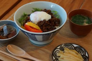 本日の151A膳は肉味噌丼温泉卵のせです。