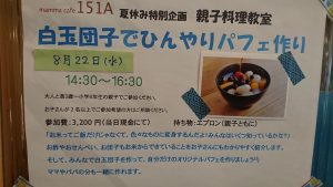 8月22日(水)に開催、夏休み親子企画第4弾、親子料理教室白玉団子でひんやりパフェ、まだまだ参加者募集中です!!
