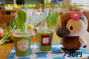 江東区産はちみつの小松菜スムージーも好評です。ぜひ、お試しください。