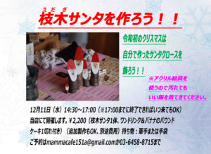 11日(水)開催の枝木サンタを作ろう!のワークショップはまだまだ参加者募集中です。お子様と一緒でもOKです。作りたがりの皆さんお待ちしてます!(^^)!