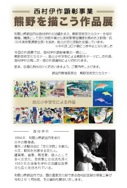 今回の作品展では、西村伊作顕彰事業の一環とし、熊野芸術文化セミナー、地元小中学生による熊野をテーマにした作品、西村伊作の残した一部の作品資料により行われます。