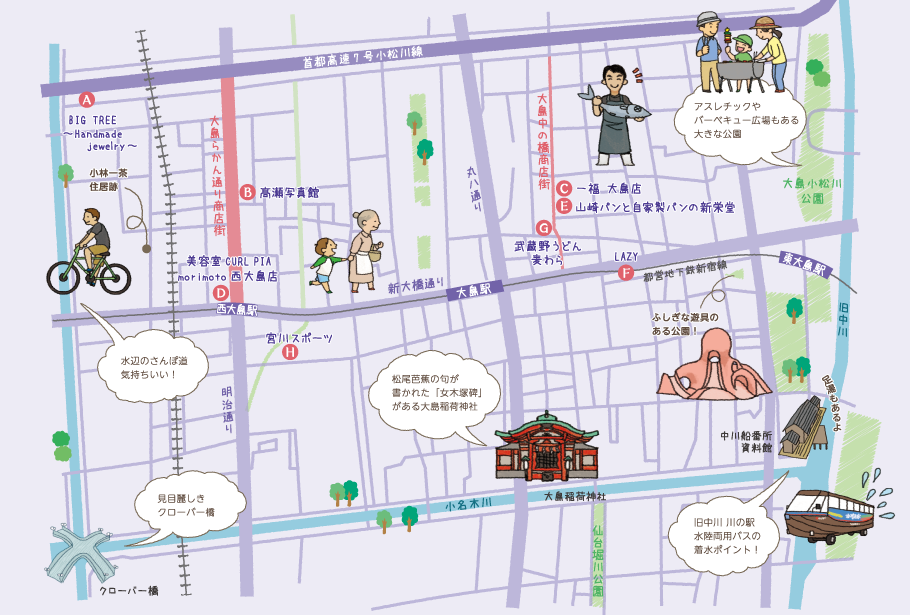 おみせの魅力再発見・大島エリア・イラストマップ(クリックで拡大)
