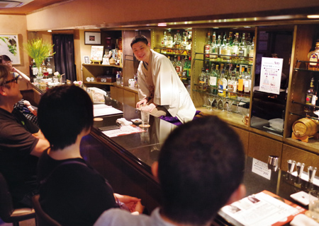 高座は、普段マスターが腕をふるうイン・カウンター。「敷居が高いというバーのイメージを払拭したくて」と、音楽好きなマスターもこの日はBGMを出囃子に変えてカクテル作り。落語が始まると手を休め、お客と一緒に笑いに興じる。