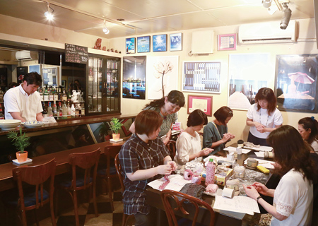 昔やった編み物をちゃんと習ってみたい!そんな時は森下のバー・ダンボに行ってみては?「ウチでよかったら使って」とマスター・竹内貴則さんからの提案がきっかけで、月に1度、路地裏の渋いバーが一転。ほのぼのした編み物教室の会場に! 分からないところはプロ講師が丁寧に教えてくれる上、おいしいお茶やケーキを味わいながら、同じ趣味を持つ人同士仲良く編み編み。あぁほっこり。楽しそう♪
