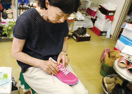 お手頃価格の婦人靴がずらりと並ぶ店内。鏡の前の丸いすに「どうぞ座って〜」と通されると、まずは日常のおしゃべり。その人の暮らしに合う靴をいろいろ出してくれる。クッション性に優れた靴、脱ぎ履きしやすい靴……。しゃべって笑って、履いてみて。そんな時間が丸ごと楽しい。