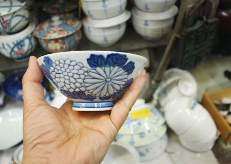 まずは、山積みされた品物の量に圧倒される。ミシンにギター、たこ焼き器……かと思えば、翡翠の置き物や木彫りの熊、絵画、時計に照明も。とにかく多種多様な品揃え。店の奥でレトロ&かわいい器を発見!これは最近じゃ見かけないわよ。そんなお宝を発掘する楽しさがたまらない。