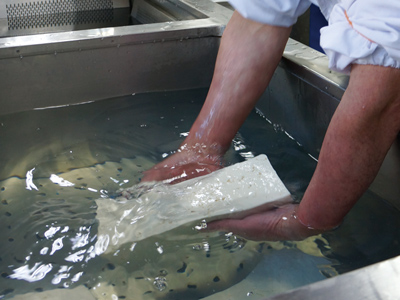 豆を摺り、煮て豆乳を絞り、凝固材を入れ、手早くかき混ぜる。桧山勝征さん・勝利さん親子にとってこの工程は身体に染み付き、一切無駄な動きがない。お互いの役割を決めて、ただ黙々と。そしてひとつ豆と向き合う作業を終えると、必ず器具を手早く洗う。身の回りを美しく。そうしてでき上がった豆腐は美しい。
