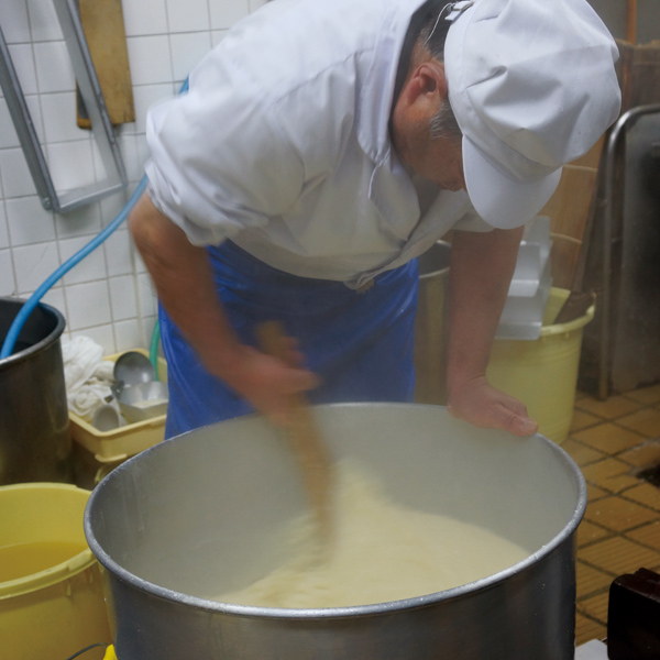 桶に入った豆乳に凝固剤を入れて手早くかき混ぜる。全身を使い、力一杯。