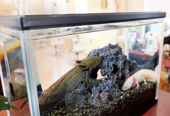 別名・メキシコサラマンダー。つぶらなお目々に、首の回りのヒラヒラ。その愛くるしい表情で、かつて一躍大人気となったウーパールーパーが、今回の主役。