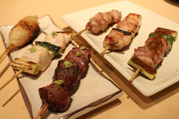 While customers can order a la carte from the yakitori menu, the Chef’s Selection (omakase) sets of six skewers for 1,870 yen are the most popular choices. From the top left are: minced chicken (tsukune) with a touch of yuzu, the tangy, aromatic citrus fruit, soft and juicy inner chicken breast (sasami) with wasabi, and a liver so soft and creamy it was almost foie gras. On the right from the top are: chicken neck (seseri) with negi onion, chicken thigh with negi onion and a truly wonderful duck and negi onion slathered with a homemade sweet miso paste.