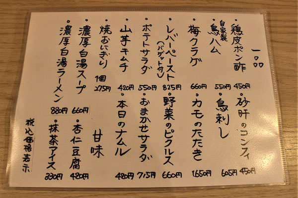 Tamashii Torikazu is justifiably proud of its chicken paitan soup, a rich yet refreshing milky white concoction based on a broth created by the lengthy stewing of chicken and pork bones. The soup also serves as the base of a ramen that is very popular with late evening diners.
