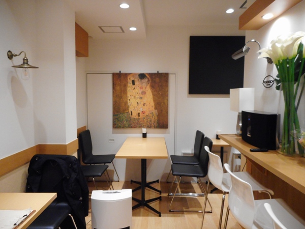 Located in a quiet, residential area, the café actually used to be the first floor of a regular home. Bright, clean, and friendly, its simple wooden furniture and artistic touches like the Klimt painting on the wall create an inviting atmosphere.