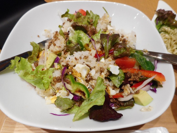 Despite her disclaimers, the taco rice which arrived was quite a spread! The main dish consists of fluffy white rice buried under a mound of toppings: lettuce, avocado, green and red peppers, onions and tomatoes create a burst of colours on the plate, and the ground beef is cooked in a complex mix of spices, creating a depth of flavours. Topped with an egg, the dish is both healthy and well-balanced!