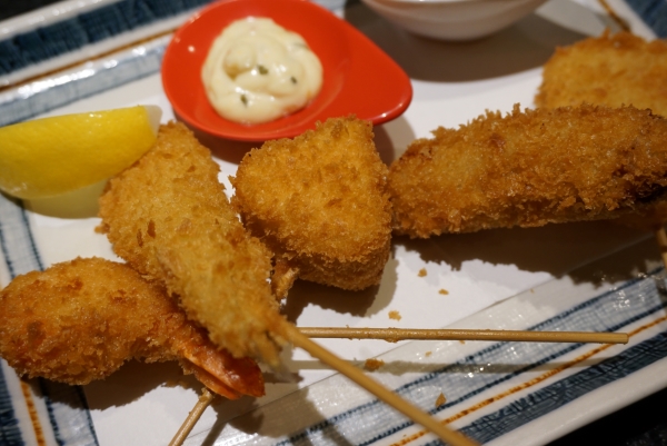 Another popular dish is Kodawari Kushiage. These delicious morsels are deep fried in panko (breadcrumbs) and come served on skewers. The 5 sticks I tried comprised ebi (shrimp), renkon (lotus), frankfurter, camembert cheese, and kisu (whiting), with a squeeze of lemon and dips of Worcester sauce and tartar sauce. Costing 700 yen, they tasted pretty good, too.
