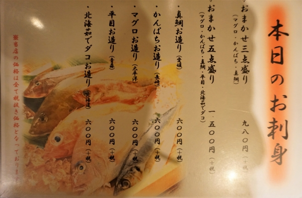 Wafuu Dining Kiraku’s menu also includes a selection of sashimi dishes for 600 yen, or a chef’s special, which comprises maguro (tuna), kanpachi (yellowtail or amberjack), and madai (sea bream), for 980 yen.
