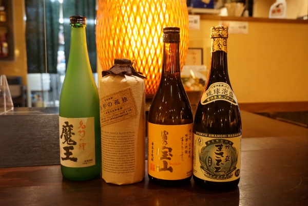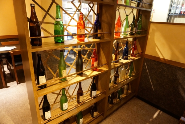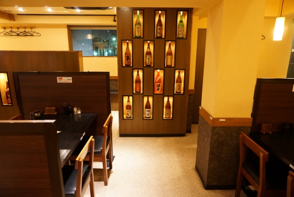 Bottles of sake and shochu are also displayed in back-lit partitions separating parts of the dining area and enhancing the restaurant’s ambience.