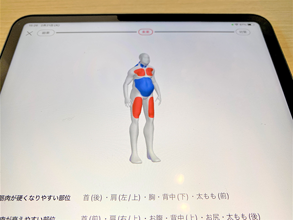 It will not only analyse your entire body condition now, but can predict future difficulties if the current problems are not rectified. The areas marked in red are at risk of becoming stiff, while the blue areas are in danger of losing muscle mass and the attendant risks that brings.