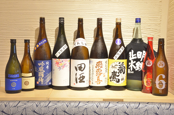 As the seasons change so do the dishes available. “We have two main menus during the year,” says Mr. Wada. “One for autumn and winter, together with a spring and summer version. We also have weekly and short-term selections which change frequently, about every ten days or so. The sake we serve changes as the seasons change. That way our customers can always experience new flavours. In autumn, sake made from mature rice suits such dishes as pacific saury (“sanma” in Japanese) and bamboo shoots in olive oil. In the depths of winter full-bodied sake served hot (“atsukan” in Japanese) matches the heavier dishes such as hot pots (“nabe” in Japanese) or stewed beef offal (“gyu-motsu” in Japanese).”