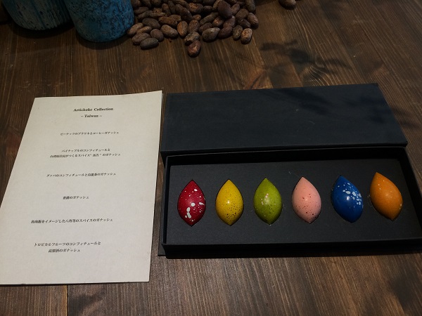 The chocolate sold at Artichoke is delicious; there are fruit truffles with deep rich flavours and ganache that melt in the mouth, releasing intense fruit flavours. Exquisite. Mr.Miyashita often works with Taiwanese cacao beans that he imports himself, as well as beans from all over the world: Grenada, Brazil, Vietnam, Colombia and so on. Chocolate drinks are available too, hot or cold depending on the season, while gorgeous-looking parfaits are on the menu in the summer.