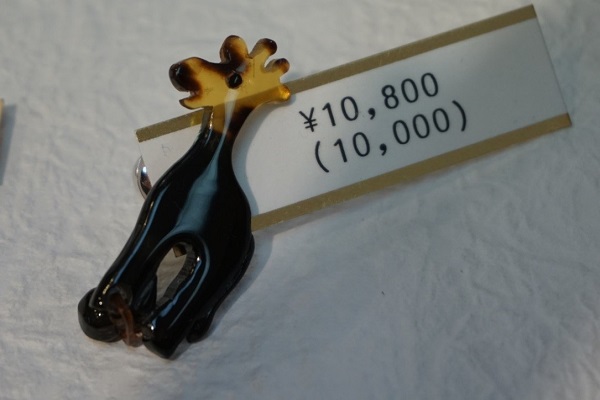 Note: for anyone thinking of sending or taking a piece of tortoise-shell jewellery out of the country, whilst bekko isogai uses material stockpiled over the years, under the current CITES (Washington Convention) agreement the hawksbill sea turtle, from which most tortoise-shell is obtained, is classified as an endangered species and the export of tortoise-shell items is prohibited. Bekko isogai displays a sign advising customers of this.