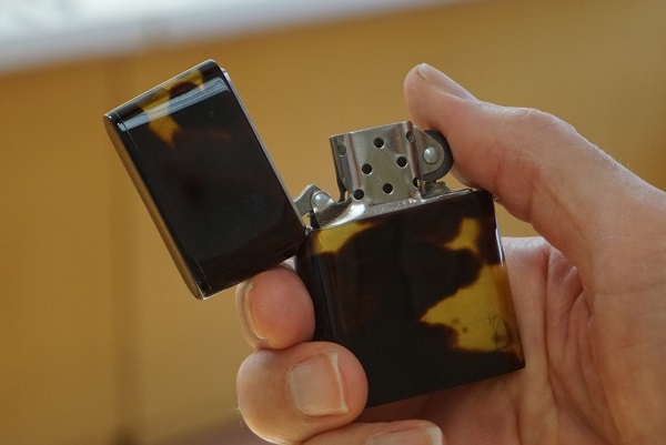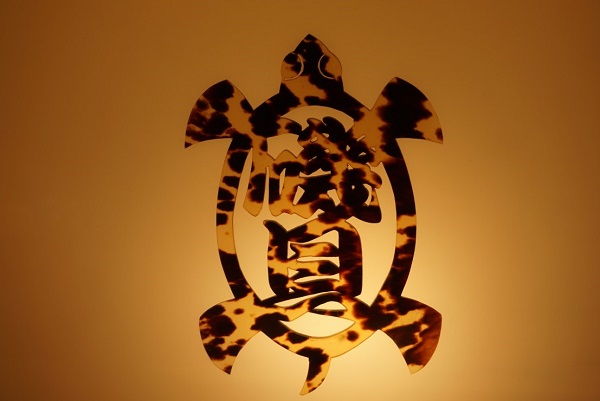 Mr. Isogai likes to experiment, and demonstrated to me the versatility of tortoise-shell  which, when soaked for several days, heated and pressed, can be bent into various shapes. This enables him to fashion items such as lighters and sugar bowls from tortoise-shell.