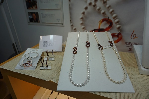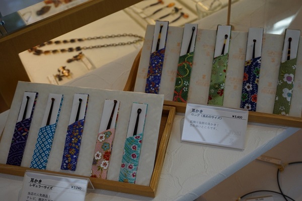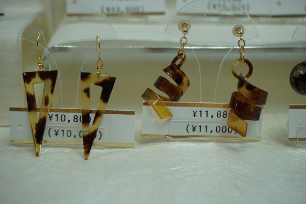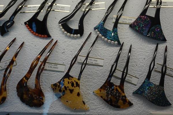 Prices range from 3,240 yen for a pair of ear rings or an ear pick to around 150,000 yen for an ornate hairpin or an order-made piece.