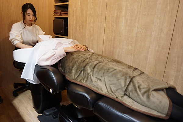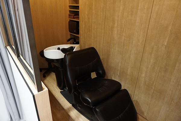 In fact, the shampoo element of the C∞ experience takes place in a small private area where, under subdued lighting, the customer is made to lie on a high-quality spa bed whilst his/her hair is expertly shampoo-ed before the Head Spa or Lift Up part of the process takes place. Mr. Kazuno is assisted with this by Ms. Eri Nakayama.
