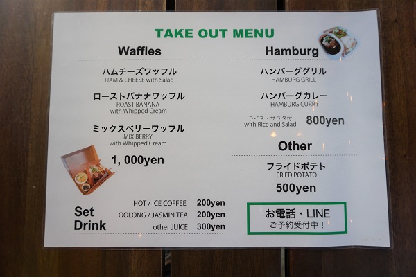 Mr. Oki says that the customers for the Take Out service are split fairly evenly between female and male, including a number of foreign residents living locally, and whilst MR.OLD MAN DINER is open from 10:30 a.m. until 12:00 midnight, the peak time for orders is around 10:00 p.m., which surprised me. I suppose if you finish work late and don’t fancy cooking or eating a heavy meal, then homemade waffles are the answer.